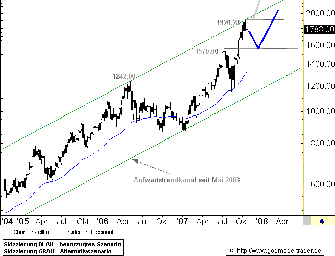 Rückblick: Die BHP BILLITON - Aktie befindet sich bereits seit 1999 in einer langfristigen Aufwärtsbewegung. Im Mai 2003 beendete die Aktie eine mehrjährige Korrekturphase und setzte die langfristige Aufwärtsbewegung fort. Diese läuft bisher in einem Trendkanal ab. Wichtige Zwischenhochs wurden im Mai 2006 bei 1242,00 Pence und im Juli 2007 bei 1570,00 Pence markiert. Nach diesem Hoch aus dem Juli 2007 kam es zu einem schnellen Rücksetzer bis knapp unter das Hoch aus dem Mai 2006. Ab Mitte August 2007 zog die Aktie wieder an und erreichte am 15.10.2007 das aktuelle Allzeithoch bei 1920,28 Pence. Damit erreichte der Minenwert auch die obere Begrenzung des Aufwärtstrendkanals seit 2003.