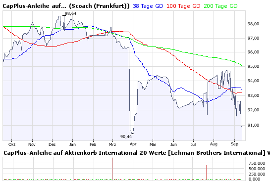 was man aus dem unten angefügten CHART leicht erkennt, der uns den Kurs-Verlauf des LEHMAN-Products "CapPlus-Anleihe auf Aktienkorb international 20 Werte" (WKN: A0D03A) recht eindrucksvoll vor Augen führt...