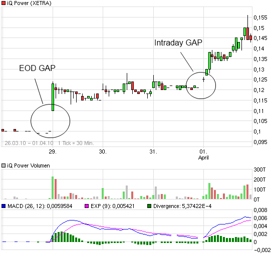 Generell sagen Gaps wenig aus, da ja diese nur entstehen wenn am Morgen die Börse um 9 Uhr zum Beispiel öffnet und bis 9.15 Uhr gehandelt wird, die Kurse aber noch nicht öffentlich sind oder... und da erst um 9.15 diese graphisch (blöd ausgedrückt) zugänglich sind, kann es sein dass sich bis 9.15 ein ordentlicher Wertverlust bz. Wertgewinn der Aktie vollzogen hat.