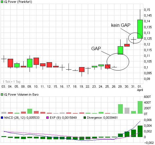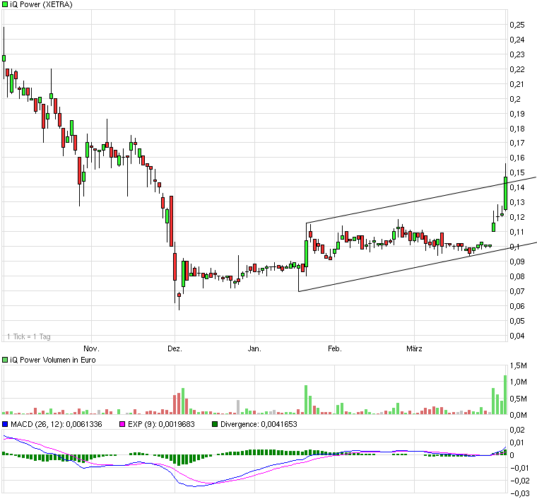 Bin gespannt ob uns das bei iQ Power, bei 0,102 EUR, erspart bleibt. Mittelfristig wird der Chart mit hoher Wahrscheinlichkeit weiter Richtung Norden laufen. Man sollte bereits positioniert sein. Abstauberlimits um die 0,105 könnten sich für div. Rücksetzer bezahlt machen. Ob man hier jedoch noch zum Zuge kommt....?