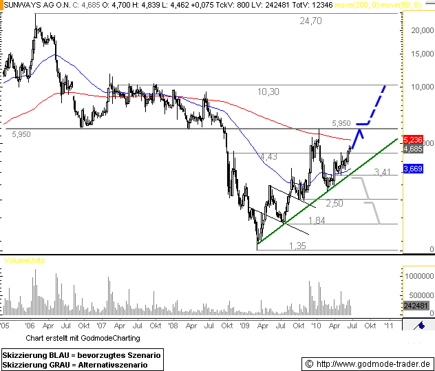 Charttechnischer Ausbruch Zeitgleich zur gelungen Präsentation auf der Intersolar ist der Aktie der Ausbruch aus dem Seitwärtstrend gelungen und hat ein weiteres Kaufsignal generiert. Neben der günstigen Bewertung - das 2010er-KGV liegt bei 9 - gefällt auch die gute strategische Positionierung. Sunways wird daher immer wieder als Übernahmeziel gehandelt.