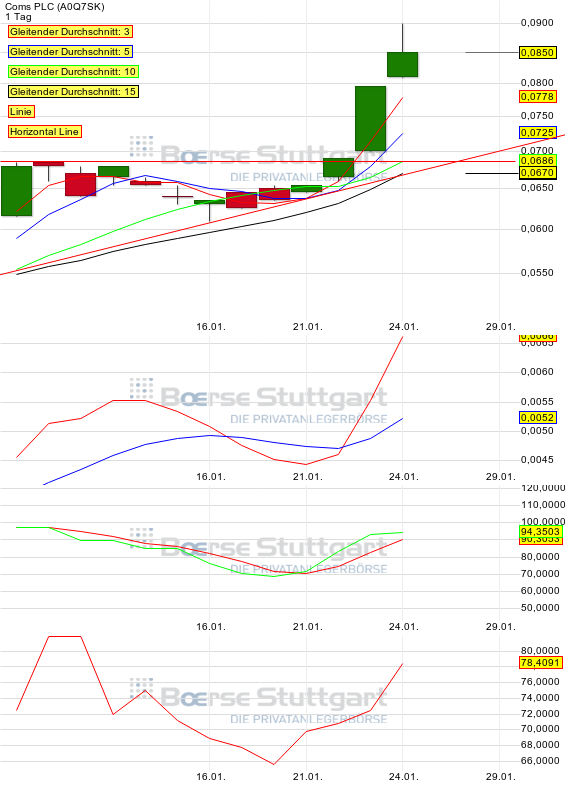 Der Widerstand bei 0,085 Pfund wurde gerade durchbrochen, dass ist ein deutliches Signal, das fünf Jahres Hoch ist nun in greifbarer Nähne, ist dies auch überwunden, ist der nächste Widerstand erst bei 0,12 Pfund, es ist noch reichlich Luft nach Oben, und dass ohne die erwarteten Nachrichten. Es scheint so als würde COMS PLC, ein großes Comeback feiern. Diese Einschätzung spiegelt nur meine Meinung wieder, und ist keine Kauf- oder Verkaufsempfehlung. Die Heutige Performance beträgt stattliche 13,33%.