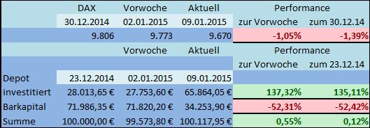 Seit Jahresanfang (30.12.2014) ist der Dax um 3,4 % rückläufig. Das Depot um "lediglich" 1,06% Dennoch ist das Depot insgesamt gut aufgestellt.