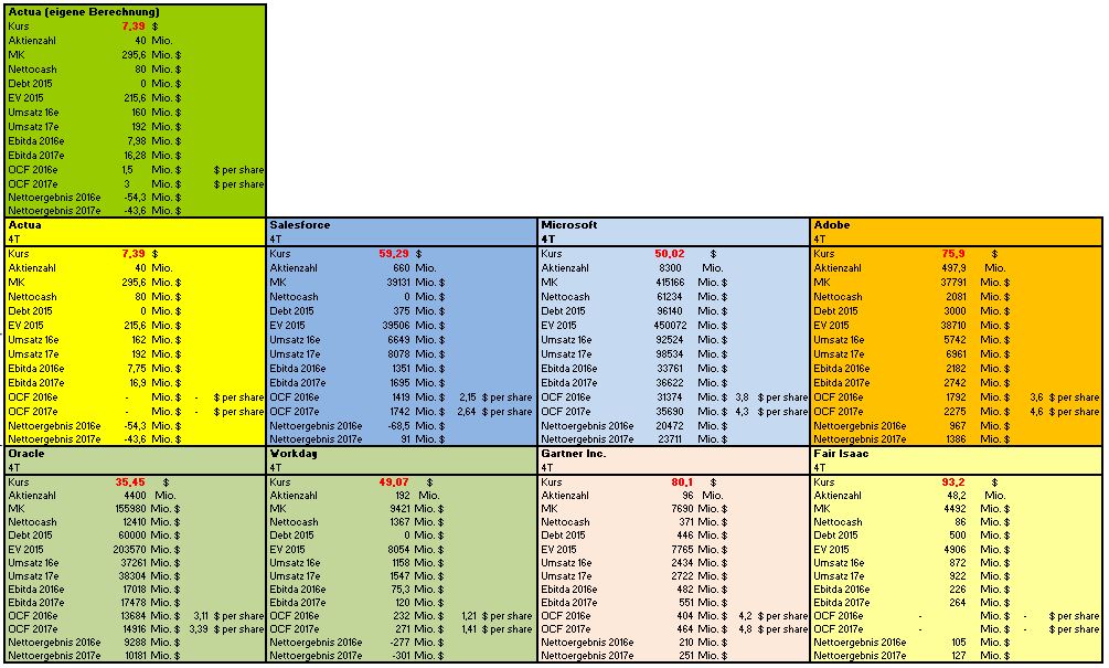 nochmals darauf hingewiesen, dass der ganze Investmentcase steht und fällt mit der Annahme, dass es Actua schafft den Umsatz in den nächsten 5 Jahren um jährlich 15-20% zu steigern. Ohne Wachtum ist die Firma gegenwärtig fair bis leicht überbewertet. Wenn man jetzt in den nächsten 5 Jahren von einem Weltuntergang bzw. Kollaps des Finanzsystems ausgeht und einhergehender rezession/Depression ausgeht, sollte man sich fernhalten. Kurszfristige Gewinne sind hier auch nicht zu erwarten.