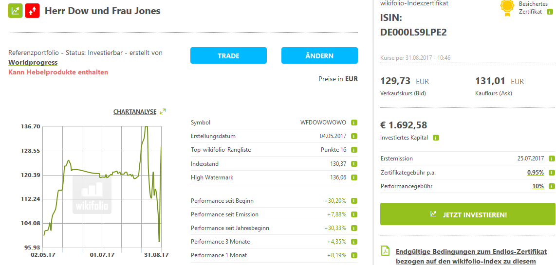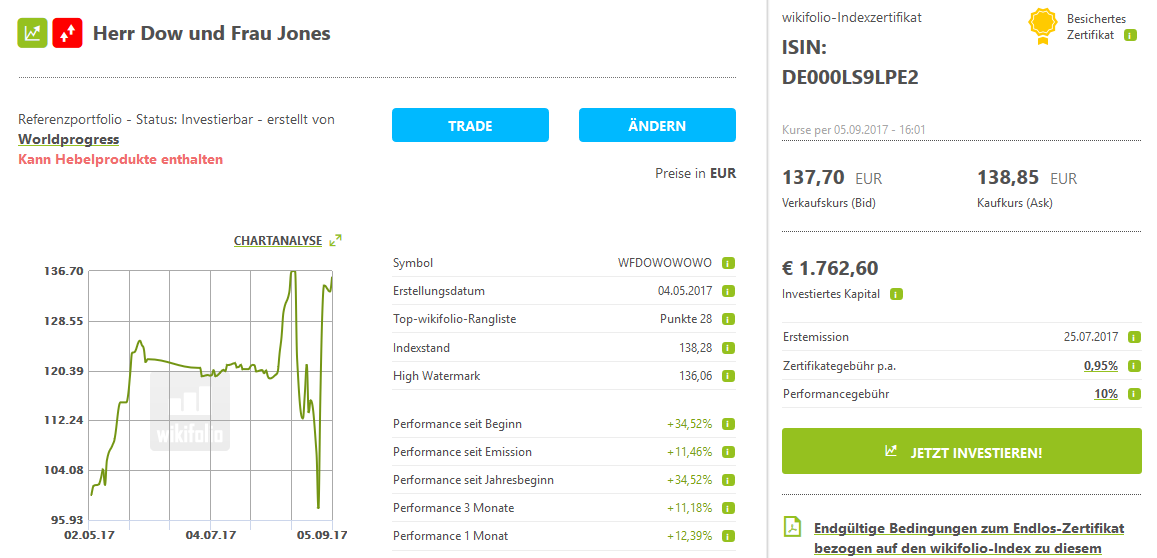 Das Wikifolio "Herr Dow und Frau Jones" ist jetzt investierbar. Die WKN ist LS9LPE.