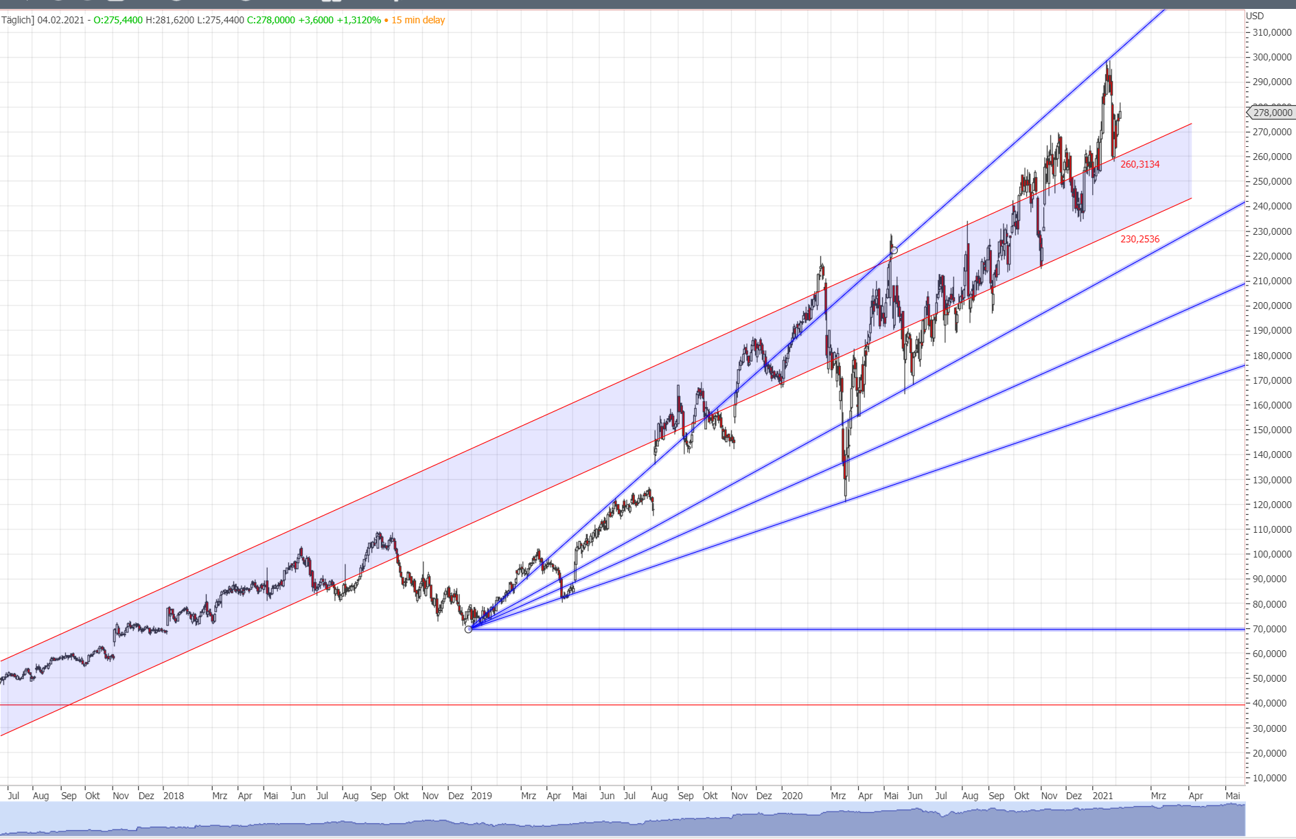 Der Kurs baut an seinem Multitopp weiter. In der Vergangenheit hat sich der Wert stoisch an Retracekanten und Standardmuster orientiert.