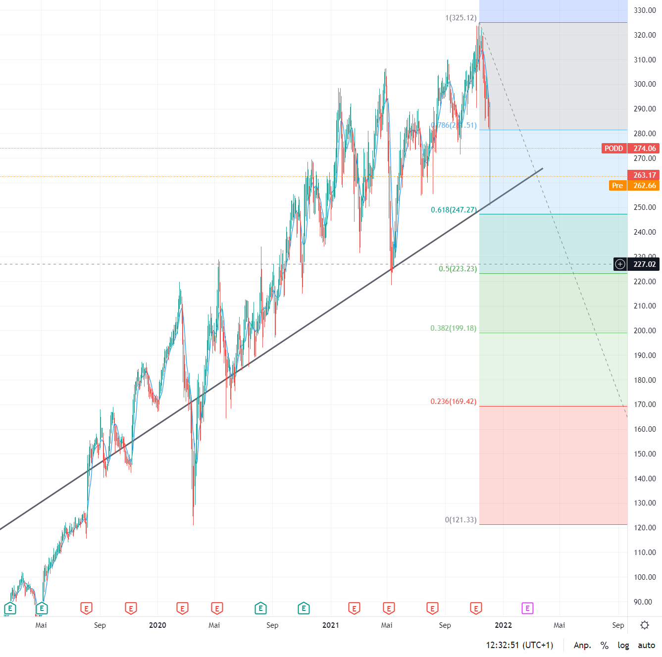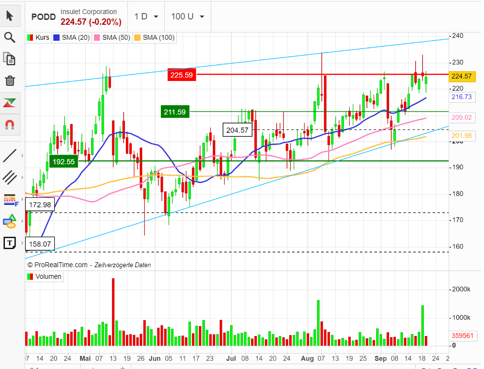 in den Charts von Dexcom, tandem diabetes und von Insulet liegt eine aufsteigende, mögliche Abprallkante exakt 44 - 45% unter den heutigen Tageskursen.