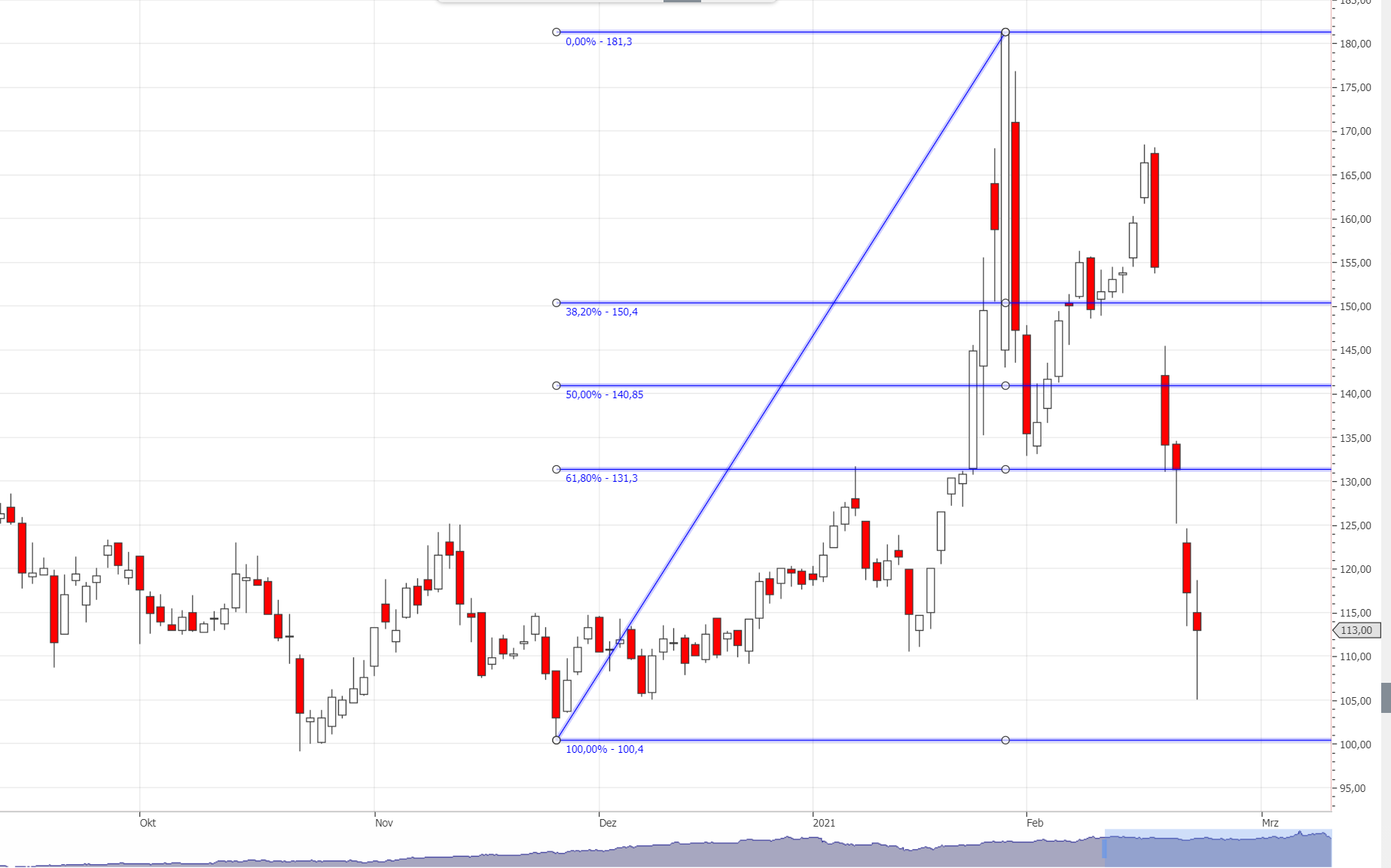 Wie man auf dem Bild sehen kann, liegen die Lunten wo ganz anders. Unterhalb von 114 lauert ein Tor auf 110.-€, wird das aufgestoßen, kann man nochmal ganz günstig auf 101 - 103.-€ nachtanken.