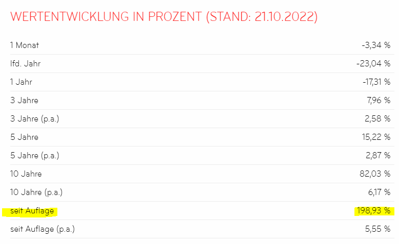 Man zahlt also nicht nur 5% Ausgabeaufschlag, 0,88% Verwaltungsgebühr - sondern muß auch vom Gewinn nochmal ordentlich was abgeben. Das relativiert den Wertzuwachs von durchschnittlich rund 10% per anno (s. Beitrag #3) natürlich nochmal ganz ordentlich und erklärt wohl auch, warum in der Tabelle nur noch von 5,55% die Rede ist.