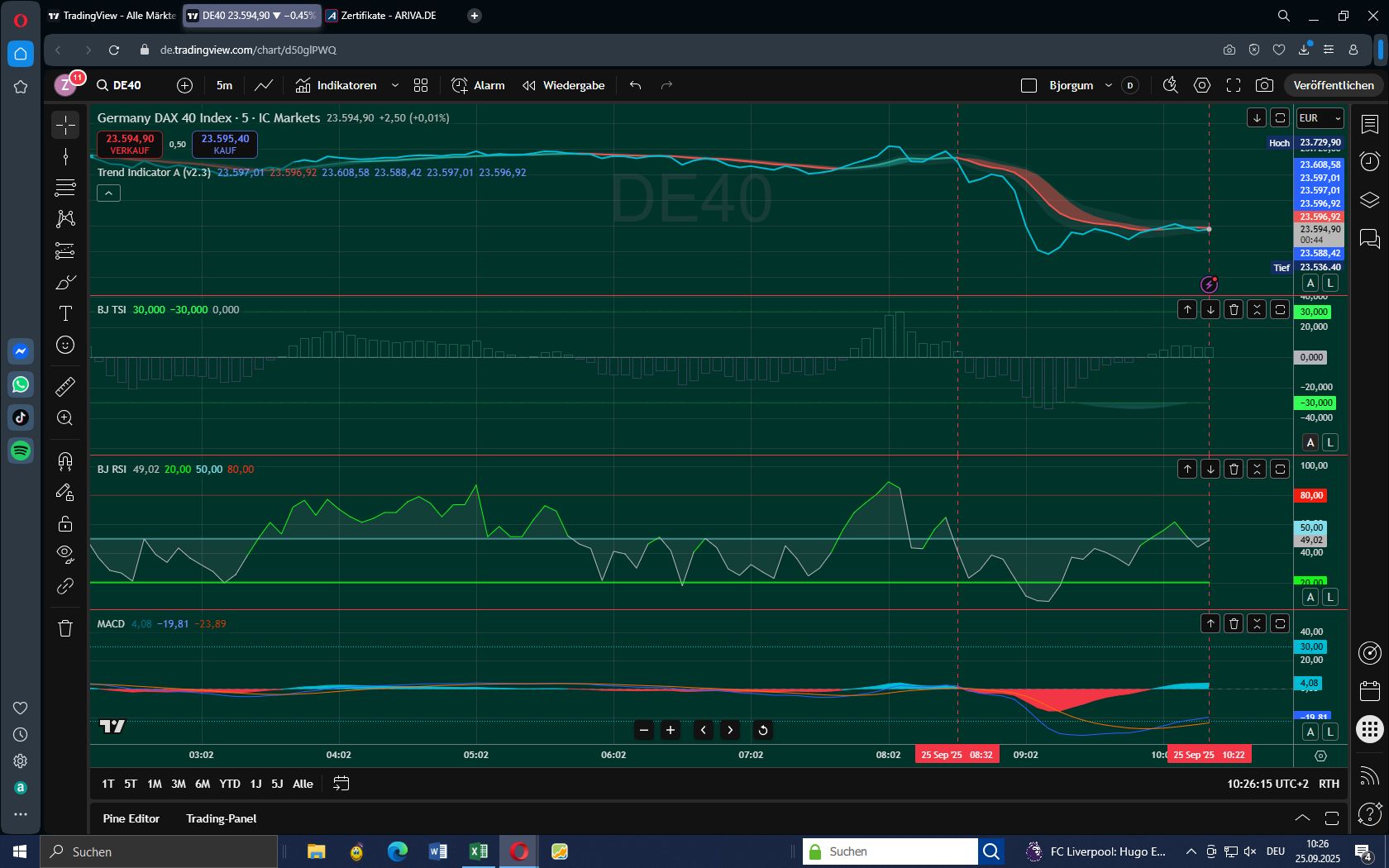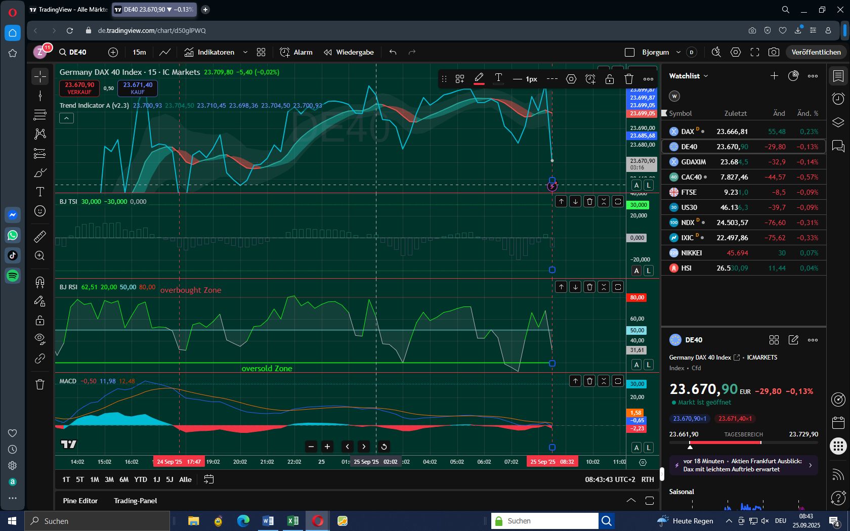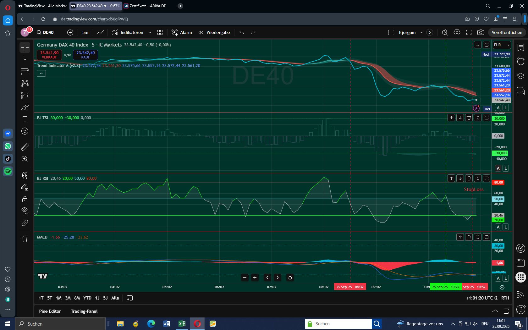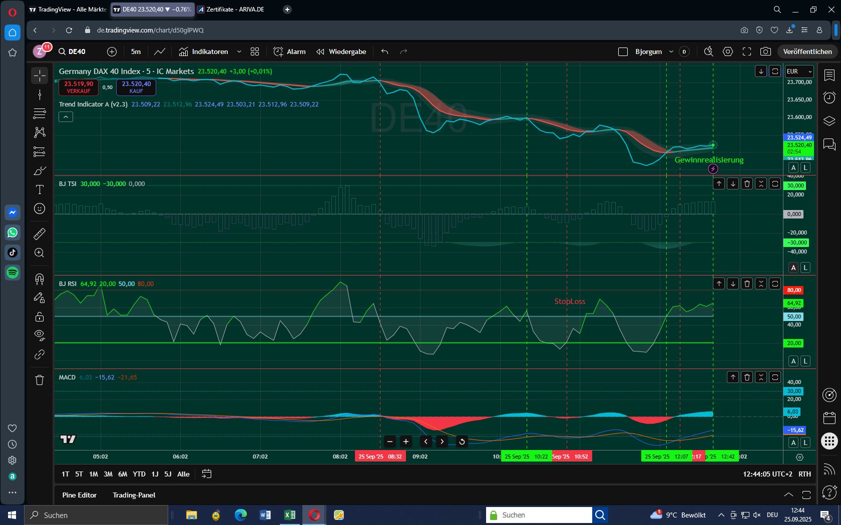 Um 12:52 unterschreitet der DAX die Trendlinie - erstes Warnsignal. Auch beim zweiten Indikator RSI taucht der DAX in die bearish Zone. Die Indikatoren TSI und MACD hingegen bleiben über der Null-Linie. Der bedeutsame RSI und das Unterschreiten der Trendlinie waren vorrangig und Grund für den Ausstieg.
