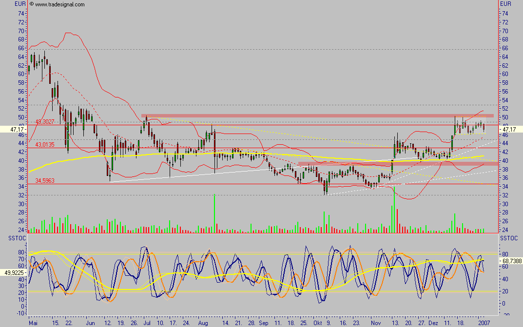 Am Freitag sei schließlich der Sprung über das jüngste Verlaufshoch vom 15.11.2006 bei 46,40 Euro gelungen. Im Anschluss hätten die nächsten Kursziele in Form des Hochs vom 08.08.2006 und 04.07.2006 bei 48,41 Euro und bei 50,35 Euro bereits ausgelotet werden können. Nach einer kurzen Verschnaufpause, die zu einem Schließen des frischen Aufwärts-Gaps bei 45,70/45,93 Euro führen könne, wäre damit mittelfristig der Weg frei, die Jahreshochs vom April/Mai bei gut 65 Euro in Angriff zu nehmen.