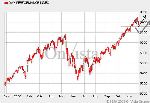 Im DAX liegt diese Linie bei rd. 6160 bis 6200 und im Nasdaq bei rd. 1750. Auf