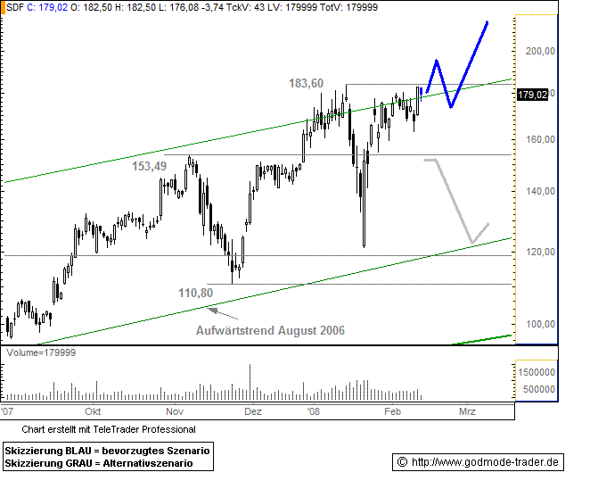 K+S - Starker Chart...Datum 13.02.2008 - Uhrzeit 12:30 (© BörseGo AG 2007, Autor: Berteit Rene, Technischer Analyst, © GodmodeTrader - http://www.godmode-trader.de/)
