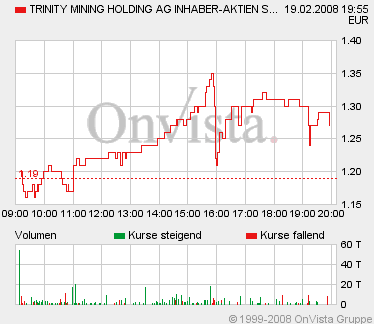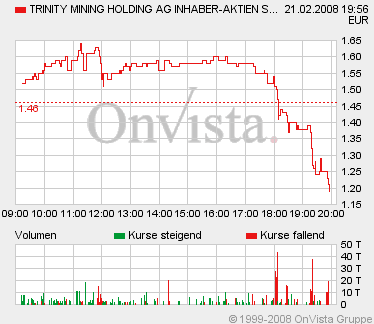 Im gestrigen Verlauf war eine erste massive Erholungstendenz deutlich erkennbar, die Aktie bildete ein Tageshoch um 1,18 Euro aus und schloss nur geringfügig tiefer bei 1,15 Euro, weit entfernt von den Tagestiefs. Dies zeigt die innere Stärke des Papiers. Wir gehen jetzt davon aus, dass Trinity Mining bald wieder Kurs auf die alten Höchststände um 1,60 Euro nimmt. Dafür spricht auch das fundamentale Umfeld, das immer klarer eine Rallye bei Trinity erwarten lässt. Aus Toronto erreichte uns nämlich die Meldung, dass bedeutende institutionelle Investoren aus der Branche ein Geheimtreffen mit dem Management von Trinity auf kurze Frist anberaumt haben.