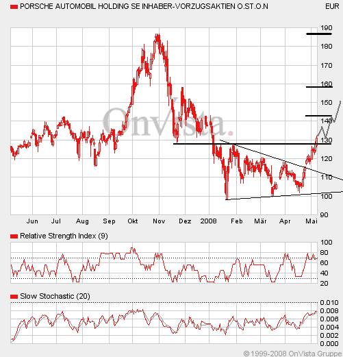 "...Fällt der Kurs nun nicht mehr nachhaltig unter 114,40 Euro zurück, stehen die Chancen gut, dass PORSCHE mit einem Ausbruch über 127,70 Euro ein weiteres Kaufsignal generieren kann. Eine neue Kaufwelle bis auf 152,90 Euro wäre dann möglich...."