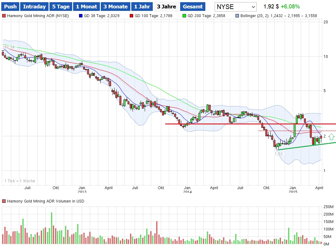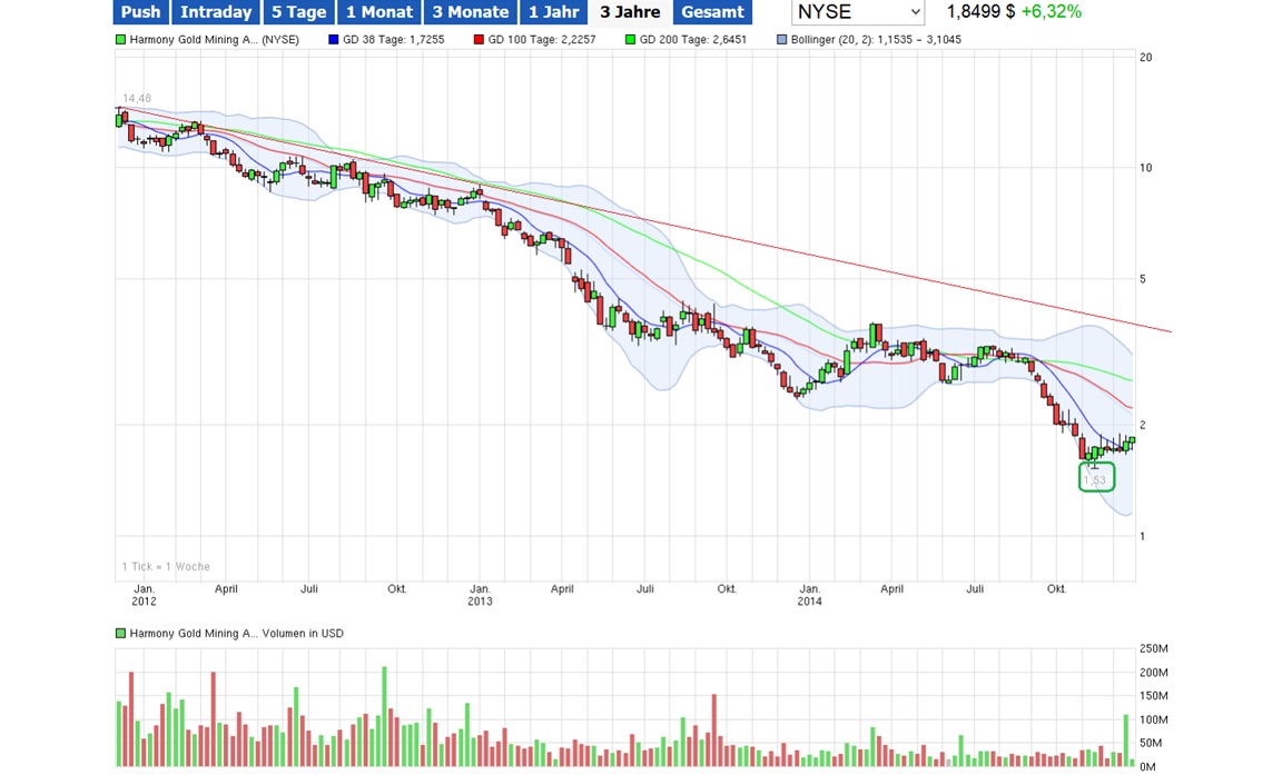 hoffentlich haben wir hier endlich einen Boden erreicht! Die gute alte Harmony Gold Mining ADR (ISIN: US4132163001) verweilt nun auch schon seit einem guten Jahr in meinem Depot und strahlt mir immer wieder in einem saftigen Rot entgegen. Es sollten so langsam mal wieder schönere Zeiten anbrechen.