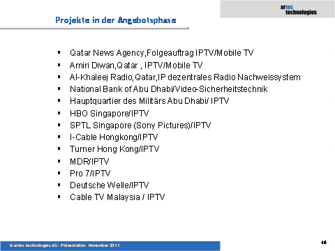 Unabhängig davon steht auch noch die Entscheidung zum Multi-Mio. IPTV Auftrag in den VAE aus. Hier ist artec im Finale gegen ein wesentlich größeres US-Unternehmen.