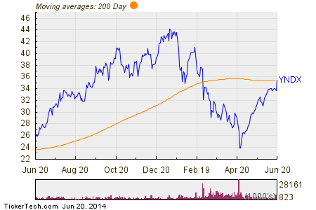 In trading on Friday, shares of Yandex NV (Symbol: YNDX) crossed above their 200 day moving average of $35.51, changing hands as high as $35.67 per share. Yandex NV shares are currently trading up about 5.2% on the day. The chart below shows the one year performance of YNDX shares, versus its 200 day moving average: