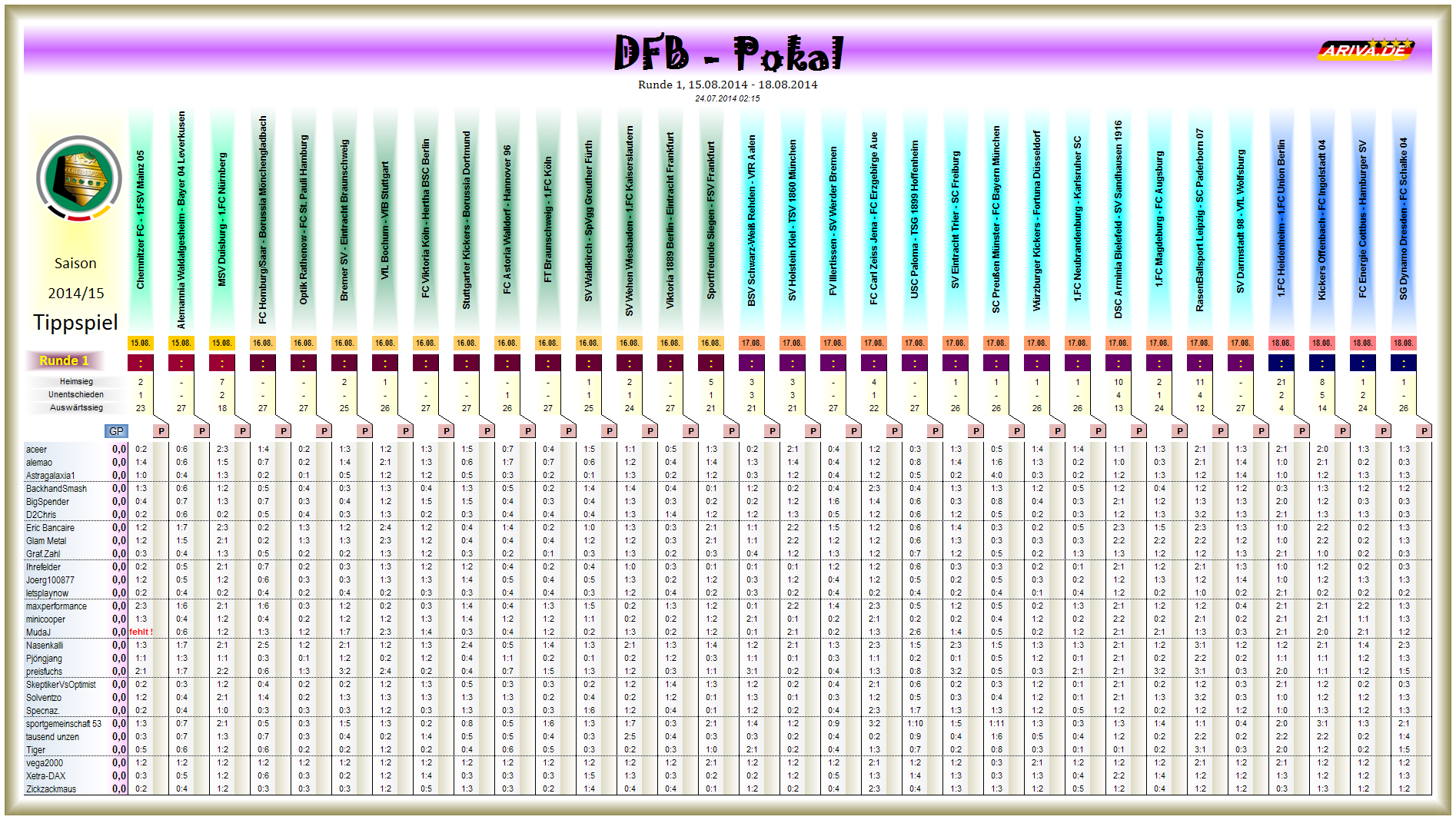Tippspiel DFB Pokal, Saison 2014/15, Runde 1