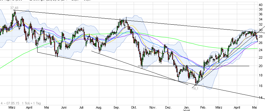 Inzwischen ist am oberen Ende der Widerstandszone eine klare Top-Bildung zu erkennen. Dem Kurs gelang es seit Anfang April trotz mehrerer Anläufe nicht die wichtige Marke von 30USD zu erobern. Seit Mai trübt sich das Chartbild (kurz- bis mittelfristig) weiter ein, da wir erstmals seit Beginn des Aufwärtstrends diese Woche ein tieferes Hoch gesehen haben könnten (rot markiert). Das zeigt sich vllt schon im heutigen handelsverlauf.