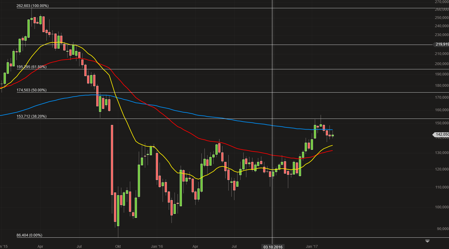 Das Kursziel 195,25 Euro für VW errechne ich aus dem Fibanocciretracement, die gemesse Strecke vom Tief 86,40 zum Hoch 262,60, das 61,8 liegt bei 195,25 Euro.