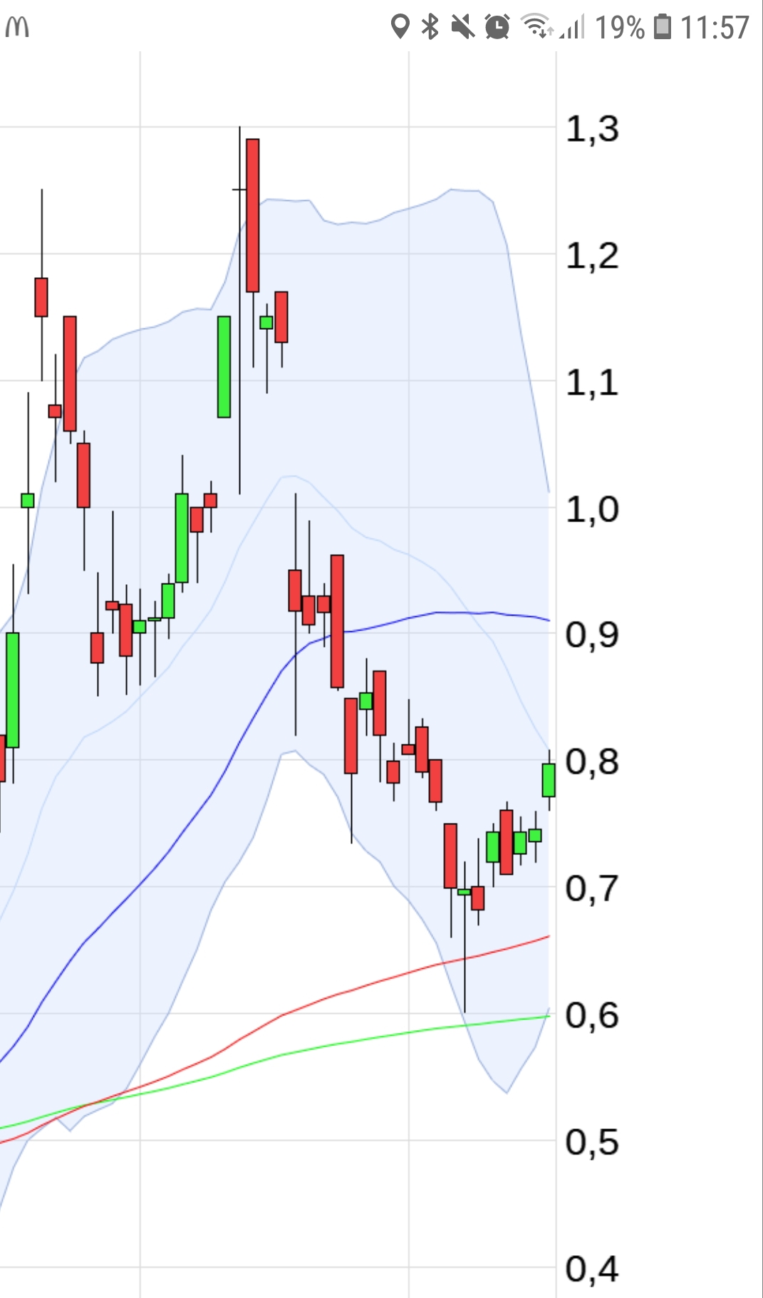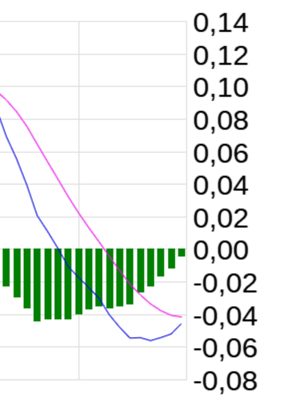 Im Folgebeitrag der MACD. Blaue Linie ist kurz davor die pinke nach Oben zu kreuzen und ein Kaufsignal zu generieren.