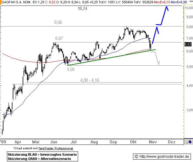 Der Kursrücksetzer unter 6,67 Euro ist zunächst bedenklich, allerdings bietet der aktuelle Bereich eine sehr gute Unterstützung. Hier verläuft eine seit Juni 2009 ansteigende Trendlinie und die exp. GDL (EMA200/rot). Das heißt, dass diese Kursbereich sehr häufig Käufer finden. Das heißt, dass die Aktie ausgehend von diesem Kursbereich nach oben abprallen sollte. Das heißt, dass die Wahrscheinlichkeit auf steigende Kurse in diesem Bereich deutlich erhöht ist.