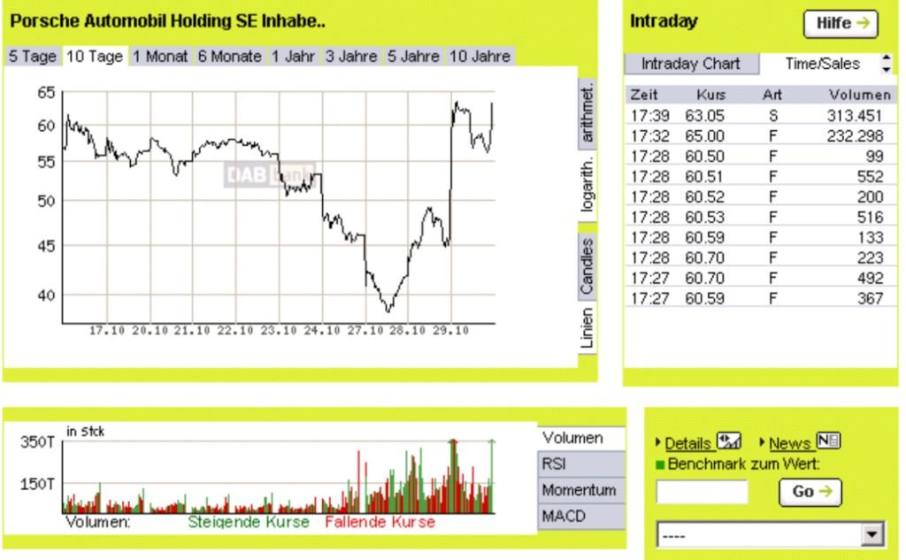 Was für die Banken perfekt war, war natürlich­ für Porsche ein Problem. Diese Halbierung­ des Aktienkurs­ von Volkswagen­ bis Freitag letzter Woche konnte Porsche natürlich­ nicht gefallen. Vielleicht­ hat Porsche aber auch direkt von dieser Aktion der Banken Wind bekommen. (Unter Umständen hing Porsche sogar mit den Banken unter einer Decke – wer weiß.) Porsche musste auf jeden Fall dringend handeln, weil ihnen durch die Kursverlus­te ein erhebliche­r Gewinn wegbrach.