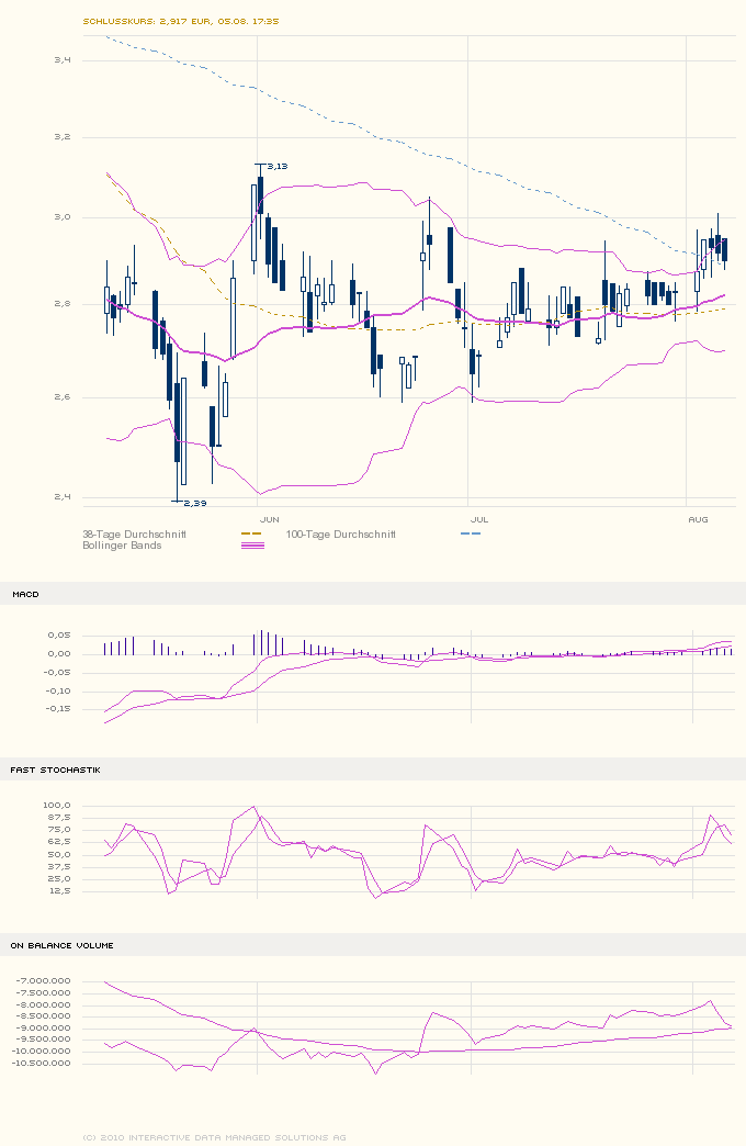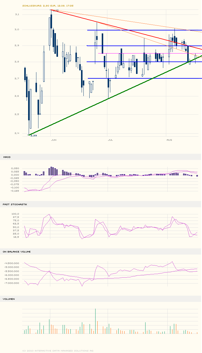 Lassen wir uns überraschen.. jedenfalls ist es in meinen Augen offensichtlich, das da jemand über den Kurs seit Wochen wacht und jegliche Ausbrüche sofort stoppt, bzw. kaufsignale.. Die Lows aus Mai, mit Alltimelow 2,391 sind Geschichte und werden auch die Lows bleiben.. Zeit wirds, mal wieder über 3Eu zu kommen.. Im Moment genießen wir ja seit Mai eben nen "kleinen" flachen Aufwärtstrend, aber wie lange hält der noch?? Und nun auch noch der drohende Rauswurf aus TecDax.. Obwohl - da seh ich evtl sogar QSC als Wackelkandidat.. Denn man schaut ja nicht nur nach der Mcap, sondern auch nach dem Börsenumsatz, und bei letzteren sind wir sogar deutlich besser wie QSC.. Es muß halt kurstechnisch so eine Art Ausbruch über 3Eu kommen, aber wann??