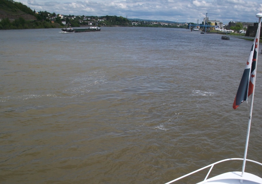 Leutesdorf gegenüber von Andernach. Das Schiff fährt stromabwärts, also nach Norden.