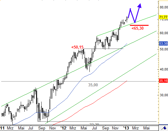 unten , geile Kurse um Euro 70. Eigentlich müßte die Aktie heute bei Euro 72,5 - 73,00 stehen.