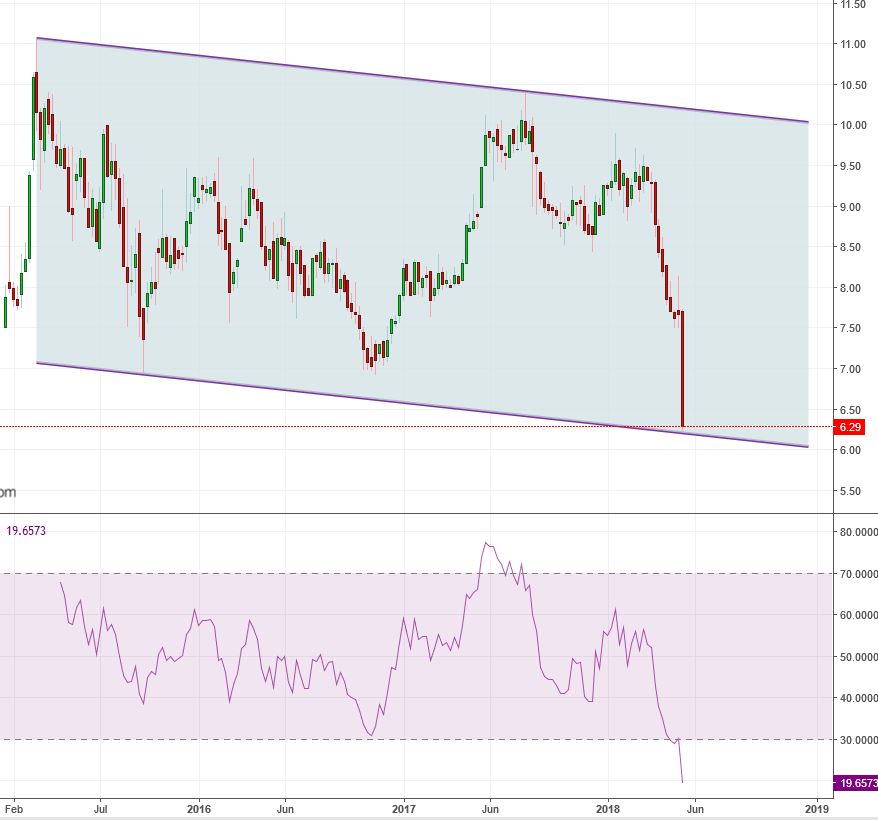 Ich sehe momentan nur einen wirklich nennenswerten Support und zwar die untere Kanalbegrenzung die heute getestet wurde (siehe Chart). Darunter gibt es eben nur noch die psychologisch wichtigen Marken (6//5,5//5 etc.). Die Risiken sind natürlich wie immer und überall an der Börse gegeben und ich kann mir durchaus auch Kurse im 5€ Bereich vorstellen, ich bin es jedoch gewohnt antizyklisch zu agieren und mir ist auch bewusst wann ich die Reissleine ziehen muss, meine Vorgehensweise ist keine Anlageempfehlung an die übrigen Leser.