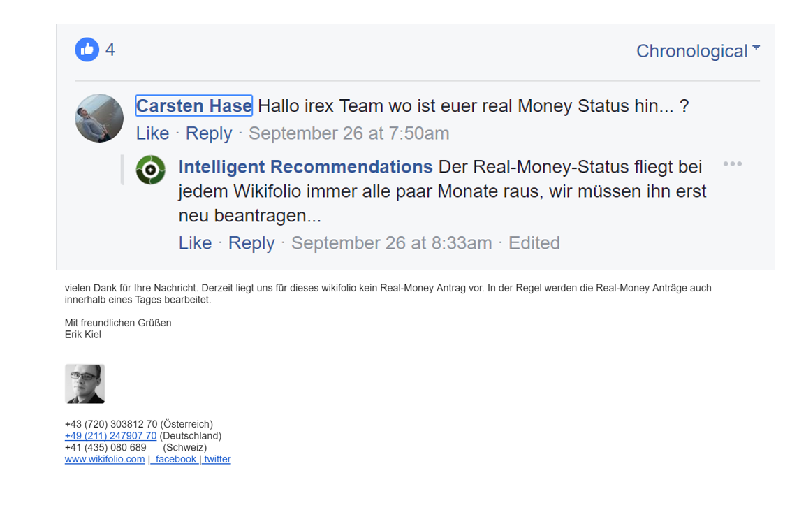 Auf der Facebook Seite von Intelligent Recommendations wird mehrmals behauptet, dass der Real Money Status alle Monate automatisch rausfliegt und neu beantragt werden muss. Laut Email von Wikifolio liegt kein Antrag vor
