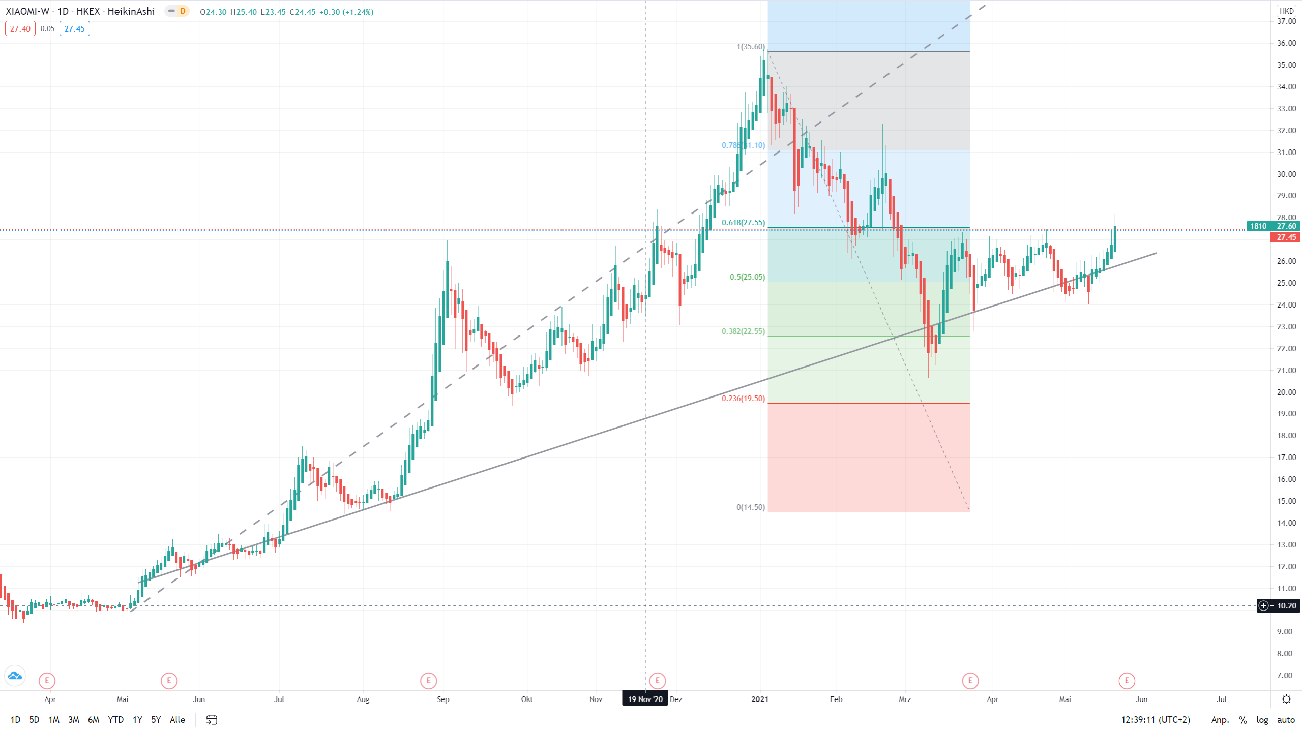 Ist für mich ein ganz klarer Hold mit Trend zum Kauf. Wer einsteigen oder nachladen will und Nerven fürs timing hat, sollte noch abwarten. Ein Gapclose wäre jetzt das sauberste, was man in diesem Jahr von Xiaomi bekommen kann. Auch wenn er vorher den downmove stoppt, ist es schon nicht mehr teuer.