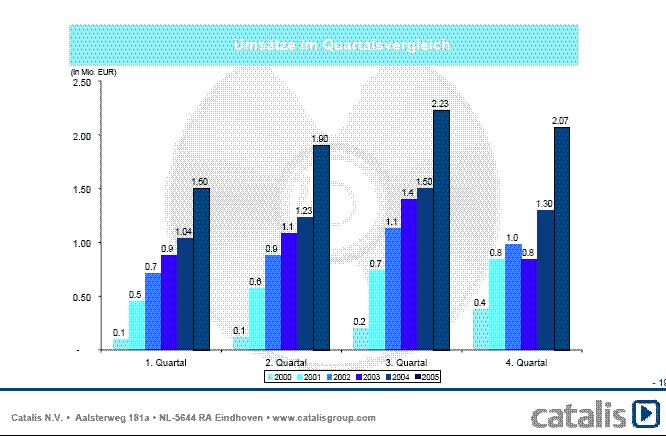 „…Neben dem stabilen Stammgeschäft der Catalis N.V. konnte besonders der Bereich \'Next Generation DVD\' (Blu Ray, HD-DVD), in welchem im 2. Quartal erste Umsätze erzielt werden konnten, zu dem erfolgreichen Geschäftverlauf beitragen. Da die Entwicklung der neuen Formate schon relativ weit vorangeschritten ist, werden hier zukünftig erhebliche Wachstumsimpulse erwartet. Ebenfalls konnten die Bereiche \'eLearning\' und \'Spiele-Testen\' weiter ausgebaut und erneut signifikante Umsätze erzielt werden, was unter anderem die gute Positionierung und die eingeschlagene Strategie der Gesellschaft bestätigt. …“