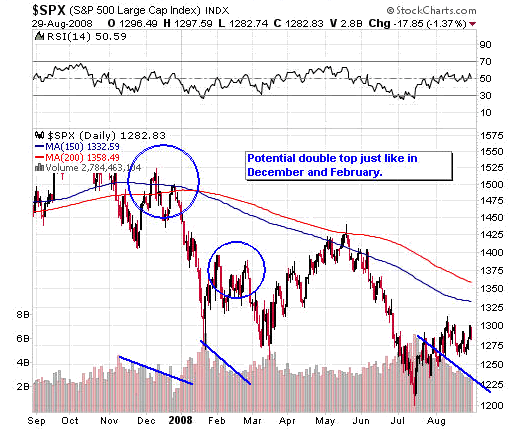 ....The market situation right now is very similar to what it was like in December and February. In both of those times the market put on a very short-lived bear market rally. During these rallies volume steadily declined just like it has right now. In fact last week was the lightest volume week of the year for the stock market. Both rallies ended with a lower high put in place. Last week the market rallied in the beginning of the week, but failed to break through it earlier August highs and turned down hard on Friday and Tuesday on higher volume.