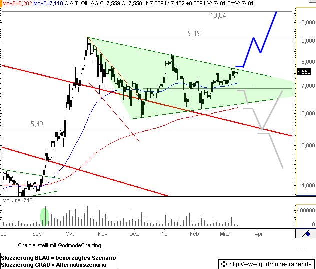 Charttechnischer Ausblick: Die Kursmuster der letzten Wochen sind konstruktiv, die C.A.T. oil Aktie könnte jetzt einen Ausbruch nach oben hin starten. Ein Anstieg per Tagesschluss über 7,73 Euro könnte wieder Kaufdruck aufkommen lassen und eine Rally bis 9,19 und 10,64 Euro nach sich ziehen. Darüber läge bei 13,05 Euro die nächste Hürde.