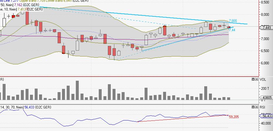Kippt die Aktie hingegen per Tagesschluss unter 6,85 Euro zurück, wird eine Abwärtsbewegung zur Dreiecksunterkante bei 6,33 Euro möglich. Unterhalb von 6,13 Euro wird ein tiefer Rücksetzer bis 5,49 - 5,80 Euro wahrscheinlich.
