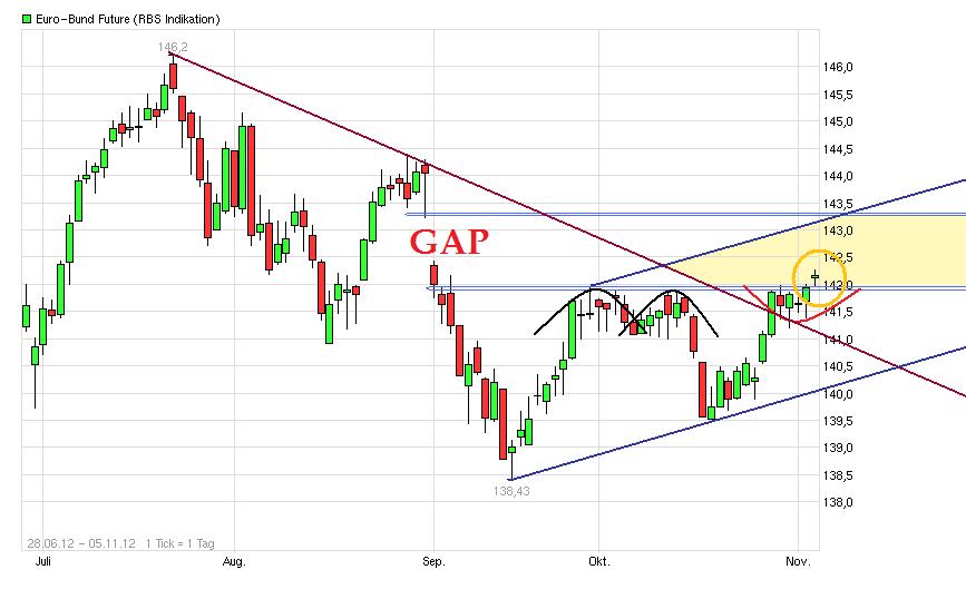 Also, ich bin mir sicher, der Bund Future fällt (mindestens bis 126, das entspricht einem Zinssatz von etwa 3 %). Fragt sich nur, wie schnell, und, ob man daraus Nutzen ziehen kann. (Beim letzten Wechsel des Futures gab es einen ziemlichen GAP, auf dem man als Short-Anleger sitzen bleibt.)