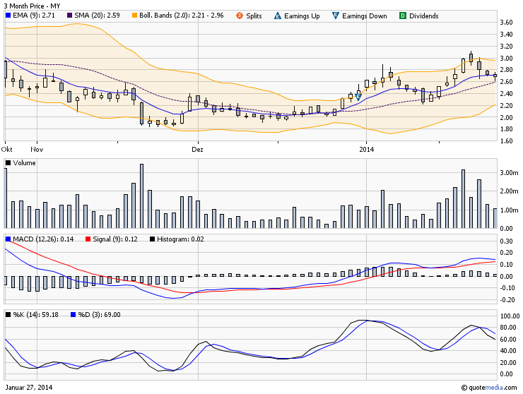 also ich würde frühestens bei erreichen des hochs von oktober bei einer kleinen übertreibung verkaufen um dann beim nächsten abpraller wieder nachzulegen. ansonsten lasse ich erstmal laufen. schau dir mal den anstieg von mit sept bis mitte okt 2013 an, nachdem letzten bearish cross 20/50er. lief steil auf. kannst natürlich jetzt schon auf eine kleine korrektur in den bereich $2,65 / 2,60 spekulieren. ist geschmackssache.