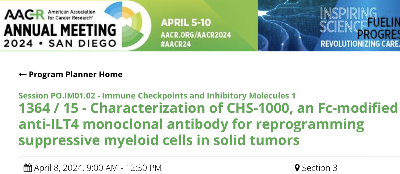 Abstract: Tumorresidente immunsuppressive myeloische Zellen spielen eine wichtige Rolle bei der Induktion der Resistenz gegen die Krebsimmuntherapie und sind bei mehreren soliden Tumoren mit einer schlechten Prognose verbunden. Der Leukozyten-Immunglobulin-ähnliche Rezeptor B2 (LILRB2), auch bekannt als ILT, wird hauptsächlich auf myeloische Zellen exprimiert und ist ein negativer Regulator der myeloischen Zellaktivierung. ILT und seine primären Liganden (HLA-G, HLA-A) sind in verschiedenen festen Tumoren weit verbreitet und sind mit Krankheitsprogression, Tumormetastasierung und schlechtem klinischem Ergebnis verbunden. Die Aufhebung von hemmenden Signalen, die durch ILT4 und seine Liganden vermittelt werden, ist eine vielversprechende Strategie, um unterdrückende myeloische Zellen neu zu programmieren und die Wirksamkeit von Immun-Checkpoint-Therapien zu verbessern. Hier berichten wir über eine IND-aktivierende präklinische Charakterisierung von CHS-1000, einem neuartigen rekombinanten humanisierten Fc-modifizierten IgG1-Antikörper mit abgeschwächter Fc-Gamma-Rezeptor (FcyR)-Bindung, der speziell auf Immunglobulin-ähnliches Transkript 4 (ILT4) abzielt. CHS-1000 bindet selektiv an menschliches ILT4 mit hoher Affinität und blockiert stark ILT4-Interaktionen mit seinen primären Liganden (HLA-A, HLA-G). Funktionell fördert CHS-1000 die Repolarisation von suppressiven myeloischen Zellen zu einem entzündungsfördernden Phänotyp und verbessert die Aktivierung von dendritischen Zellen und T-Zellen.Kombinationen von CHS-1000 mit PD-1-Inhibitoren oder anderen Immuntherapiemitteln sind besonders vielversprechend für eine verbesserte Anti-Tumor-Aktivität. Diese präklinischen Charakterisierungsdaten unterstützen die klinische Entwicklung von CHS-1000 in Kombination mit Toripalimab (einem Anti-PD-1-Antikörper im kommerziellen Stadium) als Immuntherapie für Patienten mit soliden Tumoren.