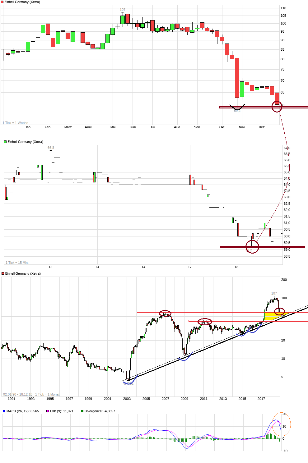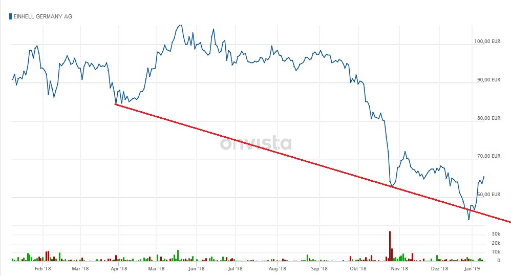 Was die Aktie angeht, könnte man jetzt einen Doppelboden bei 59 € bilden. Man hat jetzt ein KGV knapp unter 10, trotz deutlicher Währungsbelastung. Falls Einhell in 2019 wieder wachsen kann, sollte das ein gutes Einstiegsniveau sein. Zumindest im Bereich Power X Change kann man sich da ziemlich sicher sein.