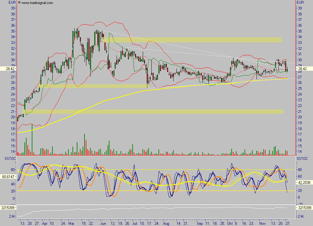 an der Mittellinie der Bollinger Bänder gedreht hat und vielleicht einen Hammer ausbilden könnte, Bestätigung erst bei Schlußkurs