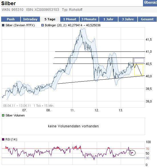 In den letzten beiden Tagen ist Silber mehrmals knapp unter 40 Dollar abgeprallt und dann wieder nach oben gegangen, worauf ich gestern auf einen erneuten Aufschwung gehofft habe und aufspringen wollte.