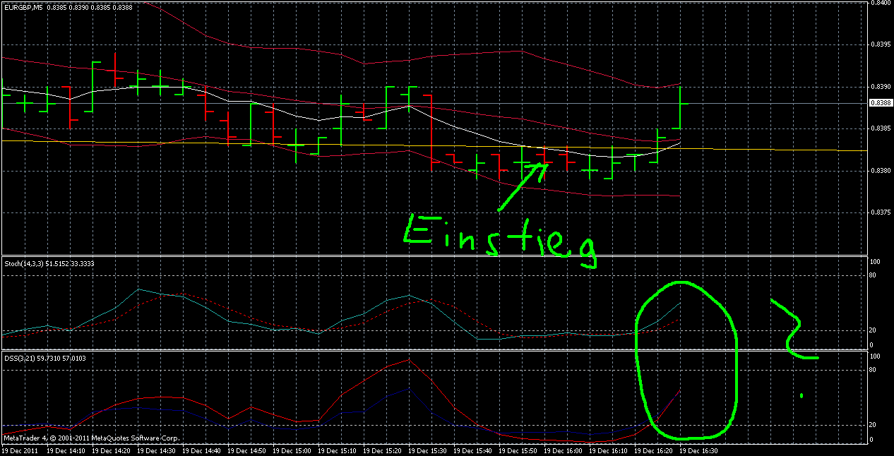Gehandelt habe ich je einmal EURGBP, GBPJPY und GBPUSD. Einstieg war jeweils eine BB-Übertreibung im Stundenchart. Alle drei Trades haben "irgendwie" geklappt, auch wenn der Ausstieg eher geraten war. Für den Ausstieg habe ich den 5-Minutenchart, Widerstände + Indikatoren genutzt.