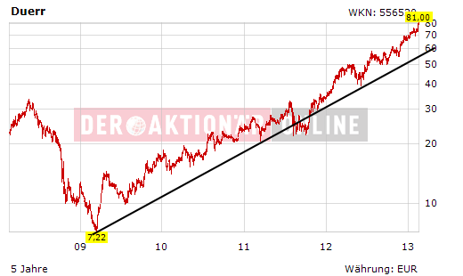 Der Anlagen- und Maschinenbauer hat nach Einschätzung von Analysten die für 2012 angepeilten Bestwerte problemlos erreicht. Getragen von kräftigen Investitionen vieler Autobauer in ihre Produktionsanlagen außerhalb Europas konnten sich die Schwaben bislang recht gut von der Absatzschwäche der Autoindustrie auf dem europäischen Markt abschirmen. Auch wenn die Aufträge im Sommerquartal zum ersten Mal seit längerer Zeit rückläufig waren, glauben Experten nicht, dass der teils harte Absturz einiger Autobauer Dürr das Geschäft grundlegend vermiest.