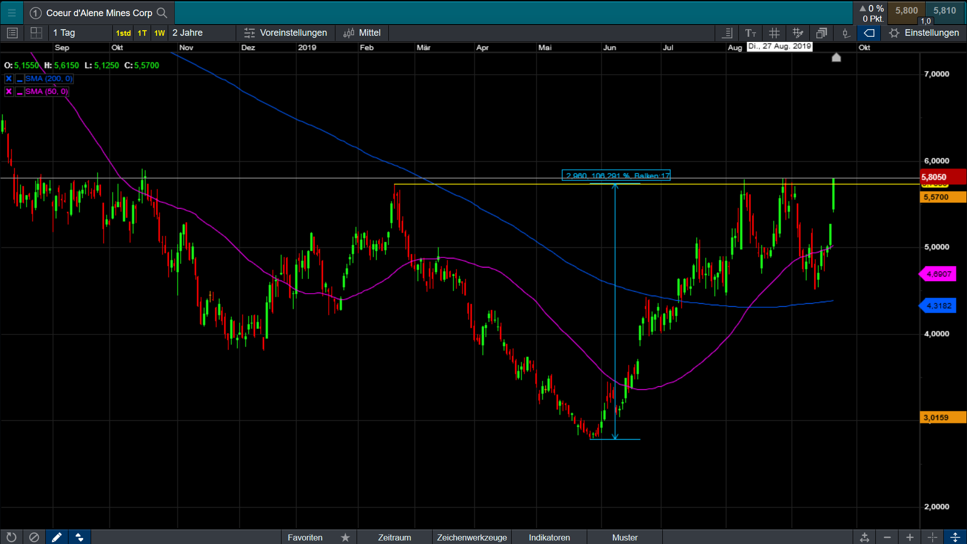 Schaut Euch einen 1- oder 3-Jahres-Chart an, Pflegt ein Bollinger Band ein und beurteilt dann die Lage.