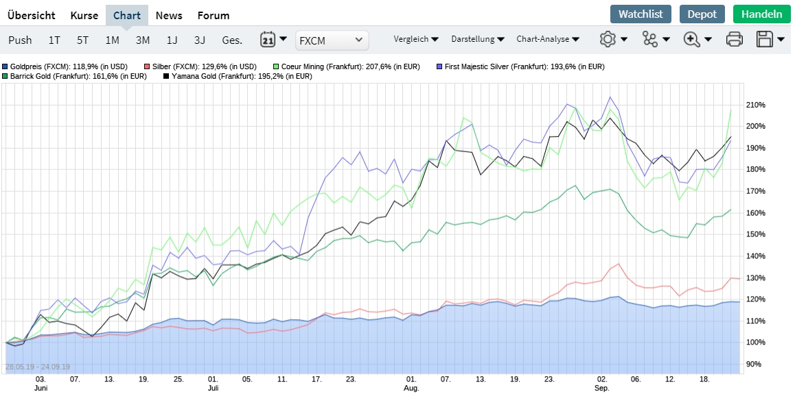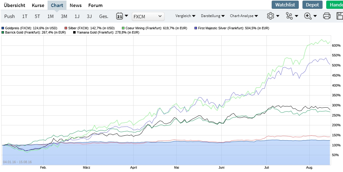 Beim letzten Aufschwung der EM in 2016 kann man sich die Entwicklung der Produzenten auch prima anschauen. Auch hier hat Coeur Mining das Rennen gemacht. Sollten sich die Preise ähnlich entwickeln wie damals wird es für einige eine Party geben. Bisher hängen die Minen allerdings dem EM Preisen hinterher. Schade eigentlich... ;)