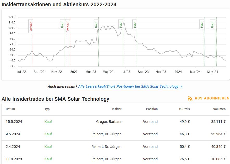 Typisch für SMA Solar. Werde jetzt ein paar Tage warten und dann eventuell nachkaufen. 30 € pro Aktie bei einem neuen Gewinn von 80 Millionen, wären wir bei einem KGV von 15. Also sehr entspannt. Wenn man sich die Insider-Käufe anschaut, dann sieht man "nur" Käufe für dieses Jahr bei fallenden Kurs. Denke der Abwärtstrend + die heutige Meldung ist das Ergebnis von Angst in der Solarbranche/EV/Klimapolitik.