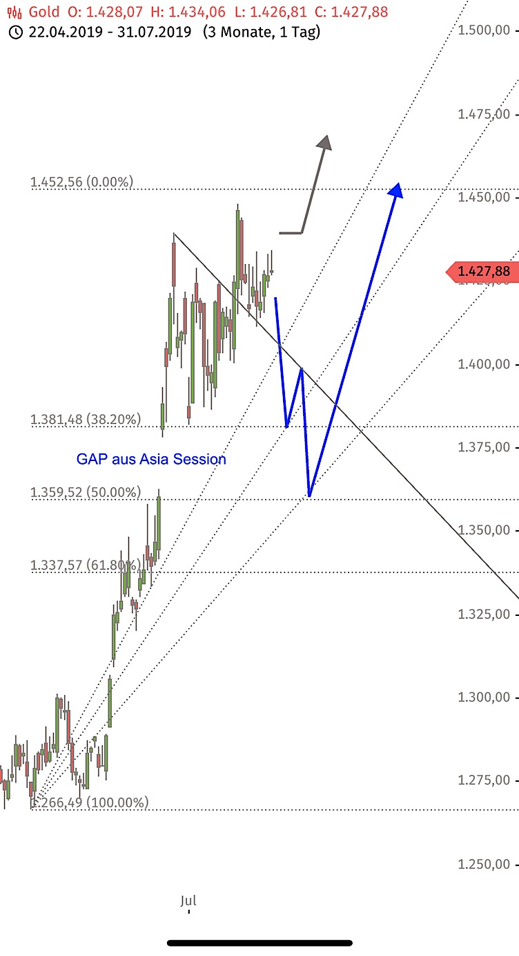 Schätze deine Analysen sehr. Mein setup sieht ähnlich aus. Bin am Hoch erstmal raus in meinem Trading depot. Bin auch sehr sicher, dass gold nochmal die 1385 oder sogar 1350 testen könnte. Da würden sich wieder gute Einstiegs Gelegenheiten ergeben.